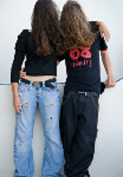 Picture of two people standing, with their long hair covering their faces