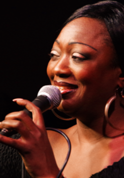 Picture of the artist, who holds a microphone in her hand. Pobierz baner (PNG, 122,30 kB)