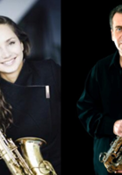 Photo of the musicians - a woman and a man, each of them holding a sax.
