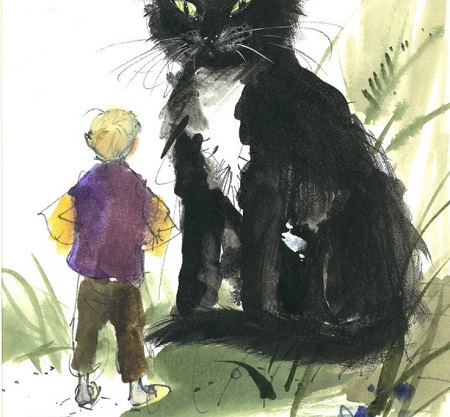 Nieproporcjonalnie duży, czarny kot z zielonymi oczami, siedzący naprzeciwko stojącego tyłem, jasnowłosego dziecka.