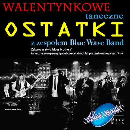 Taneczny wieczór z muzyką w stylu Blues Brothers, romantycznymi nastrojowymi walentynkowymi melodiami i szaloną zabawą w rytmie wielkich światowych przebojów na pożegnanie karnawału. Gra zespół Blue Wave Band oraz DJ.
