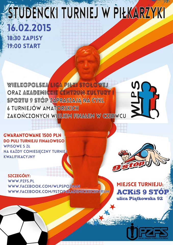 Wielkopolska Liga Piłki Stołowej oraz 9 Stóp Akademickie Centrum Kultury i Sportu zapraszają do udziału w cyklu turniejów piłkarzykowych z pulą nagród 1500zl. W ramach cyklu odbędzie się 6 turniejów kwalifikacyjnych + finał w czerwcu.