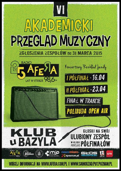 Po raz szósty Radio Afera w porozumieniu z Samorządem Studentów Politechniki Poznańskiej rusza z Akademickim Przeglądem Muzycznym. Aby wziąć udział w eliminacjach wystarczy zgłosić swój zespół do 31 marca 2015 r. na jeden z podanych w regulaminie adresów.