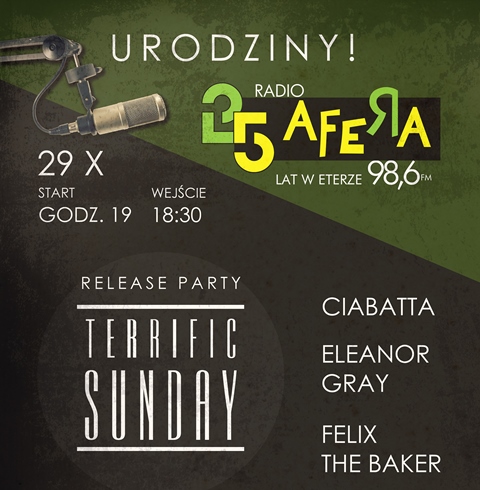Kulminacją urodzinowych obchodów będą jednak najbliższe tygodnie. Główny koncert urodzinowy odbędzie się 29 października 2015 r. w Klubie Pod Minogą. - Zapraszamy na Release Party debiutanckiego albumu grupy Terrific Sunday pt. "Strangers, Lovers" - mówi Bartłomiej Nowak, szef promocji Radia "Afera". - Na scenie nie zabraknie również innych poznańskich artystów. Wystąpią: Eleanor Gray, Felix The Baker i tegoroczny laureat Akademickiego Przeglądu Muzycznego - zespół Ciabatta.