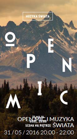 Muzyka świata to szerokie pojęcie obejmujące głównie muzykę ludową, bądź muzykę nią inspirowaną, ale również muzykę zbliżoną stylistycznie do popularnej muzyki rozrywkowej, niezależnie od miejsca jej tworzenia. Trudno dokonać innego podziału world music na style muzyczne, niż czysto geograficzne wyodrębnienie muzyki tworzonej w poszczególnych krajach lub krainach geograficznych. Podczas majowego koncertu OPEN MIC będziemy więc poruszać się po "muzycznej mapie" różnorodnych miejsc i krain, które są dla nas inspiracją muzyczną. Gościem tego wieczoru będzie Fismol.