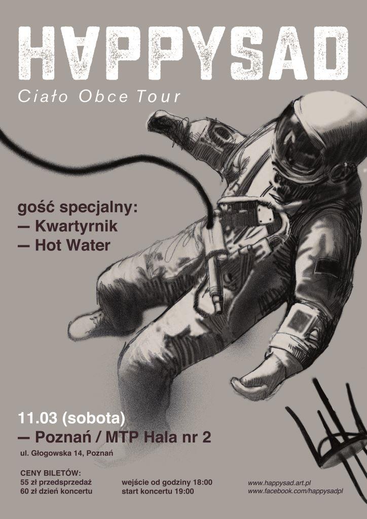 Utworów takich jak "Łydka" czy "Zanim pójdę", nie trzeba nikomu przedstawiać. Ich debiutancki album "Wszystko jedno" został w 2007 roku uznany przez magazyn Teraz Rock za jeden z 50 najważniejszych krążków w historii polskiego rocka. Kolejne albumy również spotykały się z fantastycznym przyjęciem przez fanów. Happysad wydał w październiku 2014 roku swój szósty już, album - "Jakby nie było jutra". Płyta odbiega od starego obrazu happysad, więcej w niej elektroniki, tanecznych rytmów. Na 10 lutego zapowiadana jest premiera najnowszego wydawnictwa - Ciało Obce. Ciało Obce to płyta nagrana w ponad stuletniej stodole w miejscowości Nowe Kawkowo. Zespół pod okiem Marcina Borsa nagrał dziesięć piosenek w osiem lipcowych dni zeszłego roku i jedną, nocą przy ognisku. Po raz pierwszy w historii zespół pracował w składzie sześcioosobowym. W komponowaniu i nagrywaniu materiału brali udział nowi członkowie grupy - Maciej Ramisz i Michał Bąk, którzy od dawna wspomagają zespół na koncertach. "Jesteśmy sekstetem. Cała płyta to energia sześciu osób, z których każda miała realny wpływ na jej kształt, ale także na atmosferę podczas komponowania materiału i jego nagrywania. Dzieliliśmy się inspiracjami, pomysłami, ale także problemami i nastrojami. Wszystko, co jest na tej płycie jest nasze, wspólne. Pewnie dlatego mamy nieodparte wrażenie, że jest to najbardziej eklektyczna, szalona, nieskrępowana, ale dalej bardzo szczera, płyta w naszym dorobku ". - mówią jego członkowie.Fanów pierwszych albumów happysad uspokajamy - na setliście na pewno pojawią się największe przeboje zespołu!