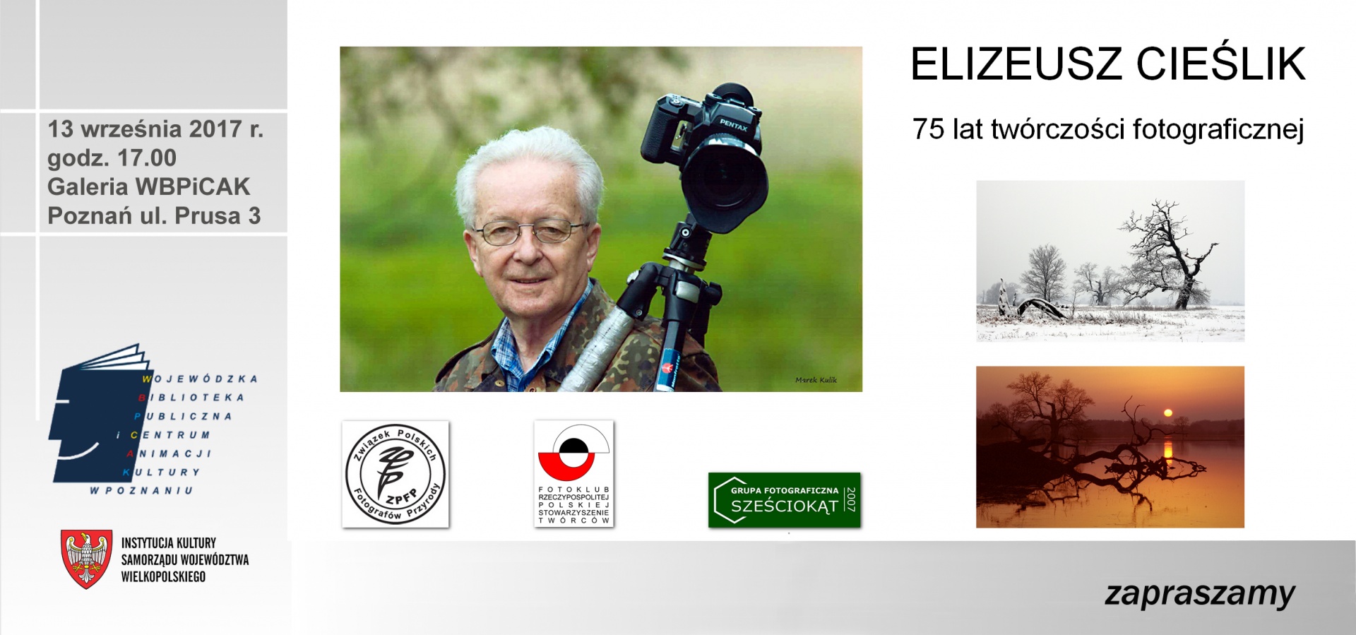 Elizeusz Cieślik zaczął fotografować w 1942 roku. Jest nestorem wielkopolskich fotografów, specjalizuje się w fotografii przyrodniczej. Jest autorem albumu fotograficznego "Rogaliński Park Krajobrazowy" i twórcą diaporamy pod tym samym tytułem. Swoim umiłowaniem przyrody i fotografii zaraża wszystkich, z którymi ma kontakt. Razem z synem opracował i realizuje autorski program edukacji fotograficznej dzieci i młodzieży. Przez kilka lat prowadził w Pigłowicach, koło Środy Wielkopolskiej jedyną w Polsce Szkolną Galerię Fotografii FOTOOKO, od 2014 roku organizuje zajęcia fotograficzne w szkołach gminy Kórnik. Elizeusz Cieślik to skromny artysta, który swoją osobowością i magią przyciąga dzieci i młodzież i uczy ich fotografii. Warsztaty Elizeusza Cieślika dla młodych adeptów fotografii to społeczny fenomen, zgłaszają się na nie tłumy młodzieży - mówi o E.Cieśliku organizator wystawy, Władysław Nielipiński z WBPiCAK. Wystawa w WBPiCAK ma charakter retrospektywny - zostaną pokazane najlepsze prace artysty, jakie na przestrzeni 75 lat wykonał i prezentował na wielu wystawach indywidualnych i zbiorowych. Podczas wernisażu Elizeusz Cieślik otrzyma także Złoty Medal za Zasługi dla Rozwoju Twórczości Fotograficznej Fotoklubu Rzeczypospolitej Polskiej.