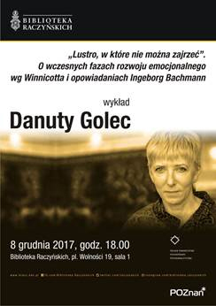 Organizatorzy zapraszają osoby zainteresowane literaturą i psychologią na wykład Danuty Golec pt. "Lustro, w które nie można zajrzeć". O wczesnych fazach rozwoju emocjonalnego wg Winnicotta i opowiadaniach Ingeborg Bachmann.