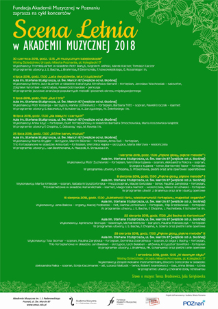 Na cykl wakacyjnych spotkań z muzyką Scena Letnia w Akademii Muzycznej w wykonaniu pedagogów i studentów zaprasza do Auli im. Stefana Stuligrosza w środy lipca i sierpnia 2018 roku (4, 11, 18, 25 lipca oraz 1, 8, 22, 29 sierpnia) oraz w czwartek, 16 sierpnia, na godz. 17.00 (ze względu na wypadające w dniu 15 sierpnia święto), jak również zachęca do udziału w koncertach, które zaplanowano w ramach projektu na Wolnym Dziedzińcu Urzędu Miasta Poznania w dniach 30 czerwca i 1 września o godz. 12.15.
