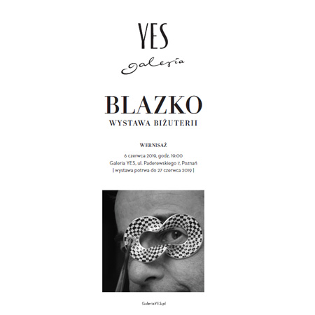 Wystawa "BLAZKO" w Galerii Yes będzie wyjątkową okazją zapoznania się z biżuterią Grzegorza Błażko poza jego pracownią. Zaprezentowane na wystawie przedmioty zilustrują głównie ostatnie lata twórczości artysty, ale nie zabraknie też biżuterii Blażko, uważanej już za "klasyczną".
