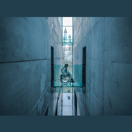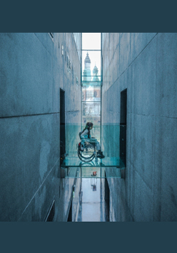 Osoba z niepełnosprawnością ruchową zwiedzająca wystawę Pobierz baner (JPEG, 129,76 kB)