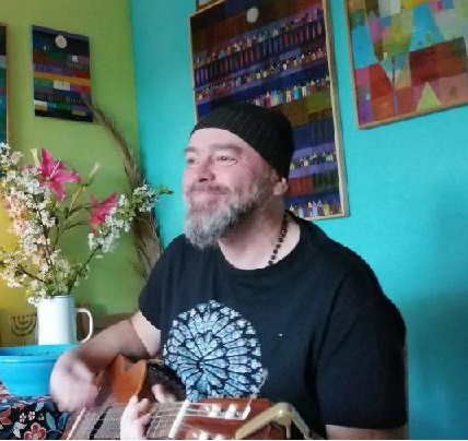 Tomasz Budzyński w czarnej czapce i ciemnej koszulce z gitarą w mieszkaniu. Po lewej zielona ściana, po prawej turkusowa. Na ścianie obrazy. Pobierz baner (JPEG, 67,15 kB)