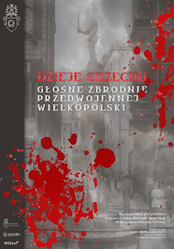Plakat przedstawia stare zdjęcie rynku w Poznaniu poplamione krwią i napisem Dzieje grzechu. Głośne zbrodnie przedwojennej Wielkopolski.