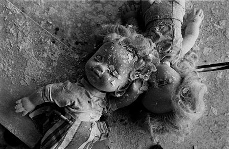 Czarno-białe zdjęcie przysypanych fragmentami pokruszonego tynku dwóch lalek, leżących na zniszczonym blacie stołu.
