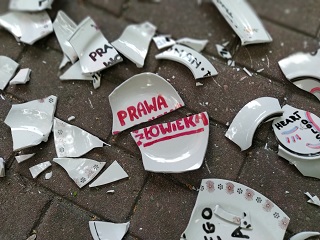 Porozbijana ceramika z napisem "prawa człowieka" na kostce brukowej. Pobierz baner (JPEG, 49,90 kB)