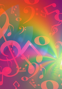 Na grafice na tęczowym tle różowe nuty. Pobierz baner (JPEG, 65,88 kB)