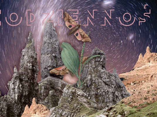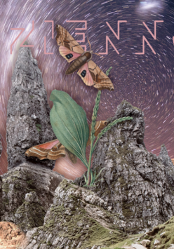 Kolorowy baner z ćmą, głazami, gwieździstym niebem.