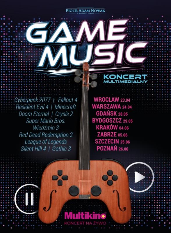 Game Music to absolutnie nowatorski koncert, będący niezwykłą gratką dla fanów gier komputerowych. Podczas koncertu na żywo, muzycy i soliści Prestige Chamer Orchestra (w składzie: instrumenty smyczkowe, instrumenty dęte, sekcja rytmiczna, popowy band) zaprezentują największe hity muzyczne znane z gier komputerowych. Usłyszymy świetne, nowatorskie aranżacje najpopularniejszych leitmotivów z takich gier komputerowych jak: Cyberpunk 2077, Resident Evil 4, Fallout 4, Doom Eternal, Crysis 2, Super Mario Bros, Wiedźmin 3, Red Dead Redemption 2, League of Legends. Silent Hill 4, Gothic 3. Ale myliłby się ten, kto uzna, że to koncert dedykowany wyłącznie fanom cyfrowego świata. Muzyka z gier komputerowych jest bowiem tak interesująca i wszechstronna (od muzyki średniowiecznej po nowoczesną muzykę elektroniczną), że koncert ten zaciekawić może także melomanów muzyki niewtajemniczonych w wirtualny świat gier. Obok muzyki na żywo, jak przystało na koncert dla miłośników wirtualnego świata, podczas koncertu, na ekranie kina, w którym odbywa się koncert wyświetlane zostaną fantastyczne wizualizacje multimedialne. Nasz nowatorski koncert po prostu wbije publiczność w fotel.