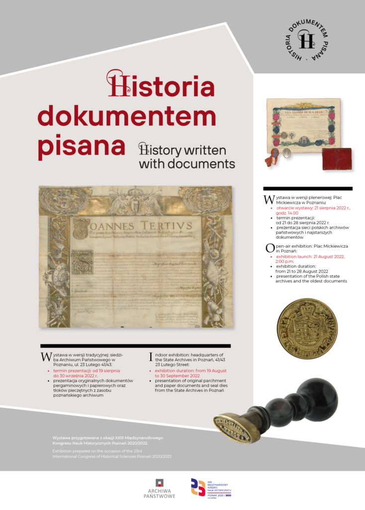 Drugim elementem wzbogacającym plenerową ekspozycję jest wystawa przygotowana w siedzibie Archiwum Państwowego w Poznaniu. Międzynarodowy Kongres Nauk Historycznych to godna okazja, aby oprócz kopii prezentowanych na wystawie plenerowej umożliwić zainteresowanym kontakt z oryginalnymi dokumentami. Na czas obrad przygotowano w holu Archiwum Państwowego w Poznaniu, drugą odsłonę wystawy "Historia dokumentem pisana", będącą swoistym wydarzeniem; rzadko bowiem oryginały, których sposób przechowywania obwarowany jest specjalnymi procedurami można podziwiać w sposób bezpośredni.