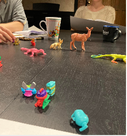 na zdjęciu widoczny stół z leżącymi kolorowymi figurkami zwierząt, za stołem widoczne fragmenty dwóch siedzących postaci