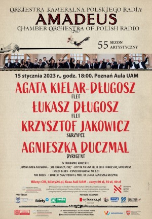 Pierwszy w Nowym Roku koncert Orkiestry Kameralnej Polskiego Radia Amadeus. Już 15 stycznia o godzinie 18:00 w Auli UAM w Poznaniu, u boku Agnieszki Duczmal, zagoszczą na scenie znakomici soliści. Wśród nich dwoje wybitnych flecistów - Agata Kielar-Długosz i Łukasz Długosz, którzy zaprezentują premierowy utwór "Nie odwracaj się!" - dyptyk na dwa flety solo i orkiestrę kameralną - Joanny Wnuk-Nazarowej.