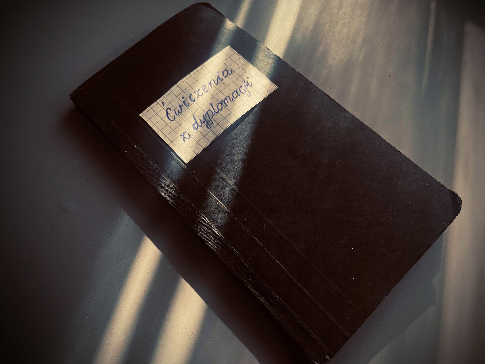 na zdjeciu widoczny czarny zeszyt, na okładce w gornej części naklejony prostokąt z kartki zeszytowej w kratkę, z napisem "Ćwiczenia z dyplomacji" Pobierz baner (JPEG, 198,46 kB)