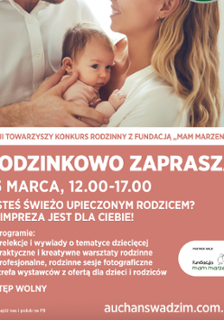 Podczas kilkugodzinnego spotkania pt. "Rodzinkowo" w będzie można zdobyć przydatną wiedzę i praktyczne umiejętności związane z opieką nad niemowlęciem i małym dzieckiem, poznać ofertę zajęć dla najmłodszych, kupić ubranka i akcesoria, a także wziąć udział w sesji zdjęciowej. Na rodziny czeka również konkurs plastyczny z atrakcyjnymi nagrodami. Partnerem wydarzenia jest Fundacja Mam Marzenie.