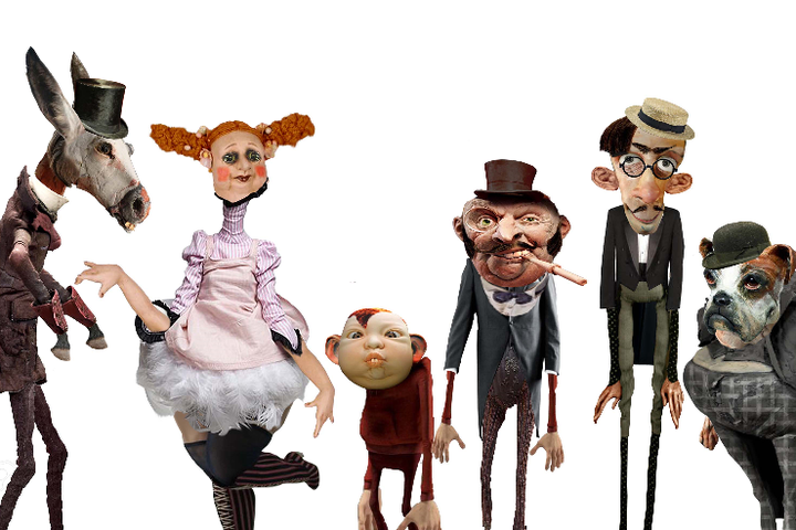 Zdjęcie kilku lalek o karykaturalnych rysach twarzy.