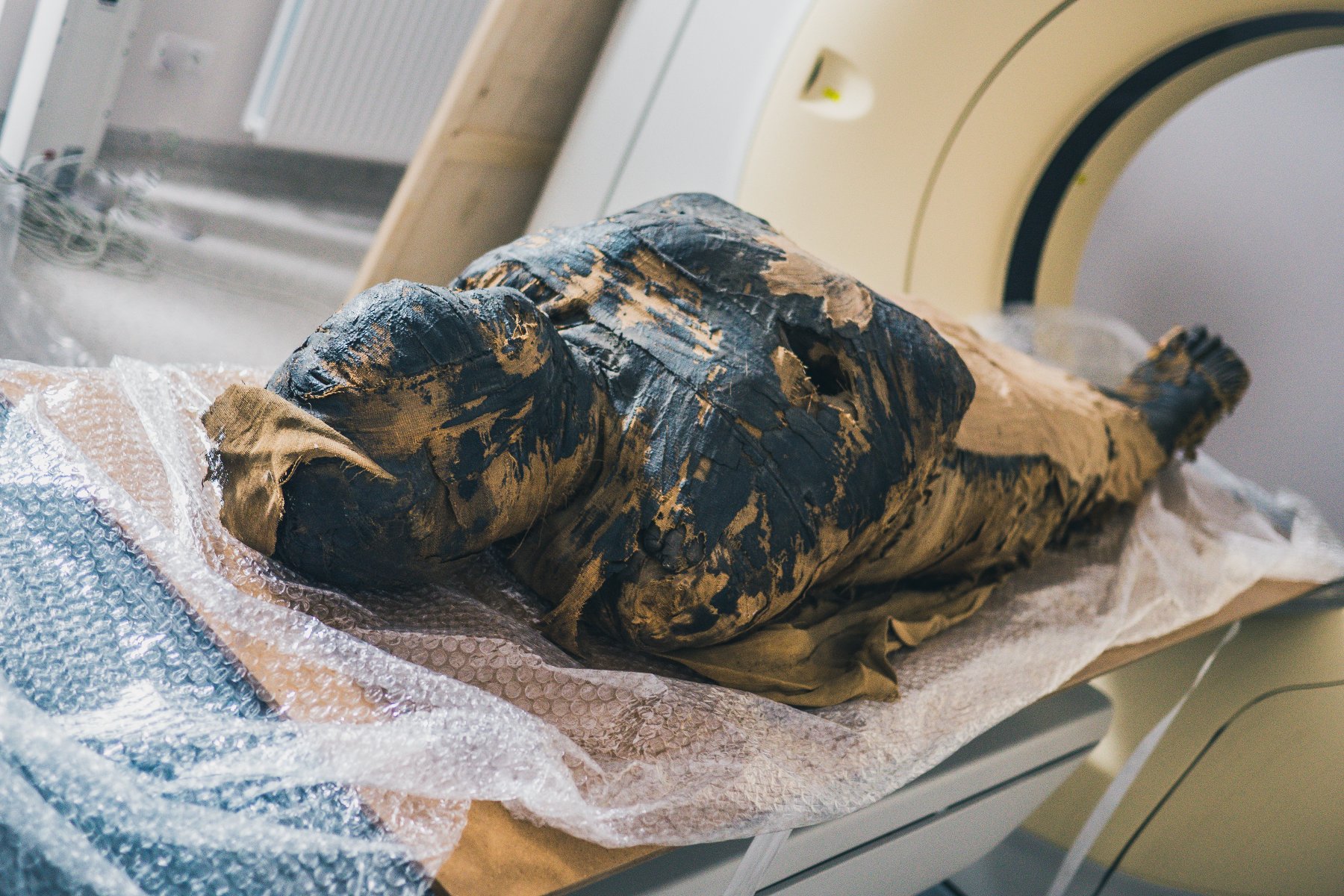 Na ekspozycji przedstawiono wyniki badań radiologicznych starożytnej mumii egipskiej, identyfikowanej do niedawna z kapłanem Hor-Dżehutim. Prace od 2015 roku prowadzi zespół polskich naukowców w ramach Warsaw Mummy Project we współpracy z Muzeum Narodowym w Warszawie. Trumna i kartonaż z mumią zostały przywiezione do Warszawy i ofiarowane Królewskiemu Uniwersytetowi Warszawskiemu przez Jana Wężyka-Rudzkiego w 1826 roku. W 1918 roku obiekt ten został przekazany w depozyt Muzeum Narodowemu w Warszawie, gdzie znajduje się do dzisiaj. W XIX wieku badacze byli przekonani, że wewnątrz przywiezionej z Egiptu trumny znajduje się mumia kobiety i dopiero w latach 20. XX wieku odczytano hieroglify na sarkofagu, jednoznacznie wskazujące na jej właściciela - kapłana Hor-Dżehutiego z 2. poł. I wieku p.n.e. - 1. poł. I wieku n.e. Badania radiologiczne przeprowadzone w latach 90. XX wieku, ze względu na niedoskonałość ówczesnej technologii obrazowania, również nie wniosły żadnych ustaleń co do płci zmarłego. Dopiero podczas prac w ramach Warsaw Mummy Project ustalono, że w sarkofagu ewidentnie znajdują się szczątki kobiety. Naukowcy nazwali je Mumią Tajemniczej Damy. Przeprowadzone badania tomograficzne i rentgenowskie wykazały bowiem, że okręcone bandażami zwłoki mają delikatną budowę, typową dla kobiet. Aby w pełni przekonać się co do płci, przeprowadzono pomiary kości i analizy ich budowy, które potwierdziły płeć żeńską. Dodatkowym dowodem były widoczne również na skanach zmumifikowane piersi oraz żeńskie organy płciowe.