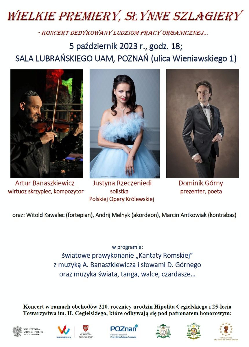 "Wielkie premiery, słynne szlagiery" - koncert w ramach obchodów 210. rocznicy urodzin Hipolita Cegielskiego i 25-lecia działalności Towarzystwa im. H. Cegielskiego, które odbywają się pod patronatem honorowym: Michała Zielińskiego, Wojewody Wielkopolskiego; Marka Woźniaka, Marszałka Województwa Wielkopolskiego; Jana Grabkowskiego, Starosty Powiatu Poznańskiego; Jacka Jaśkowiaka, Prezydenta Miasta Poznania; abp Wojciecha Polaka, Prymasa Polski; abp. Stanisława Gądeckiego, Metropolity Poznańskiego.