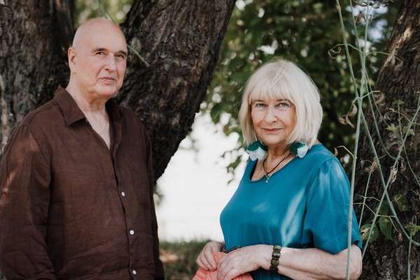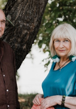 Zdjęcie mężczyzny i kobiety - uczestników spotkania - na tle drzew.