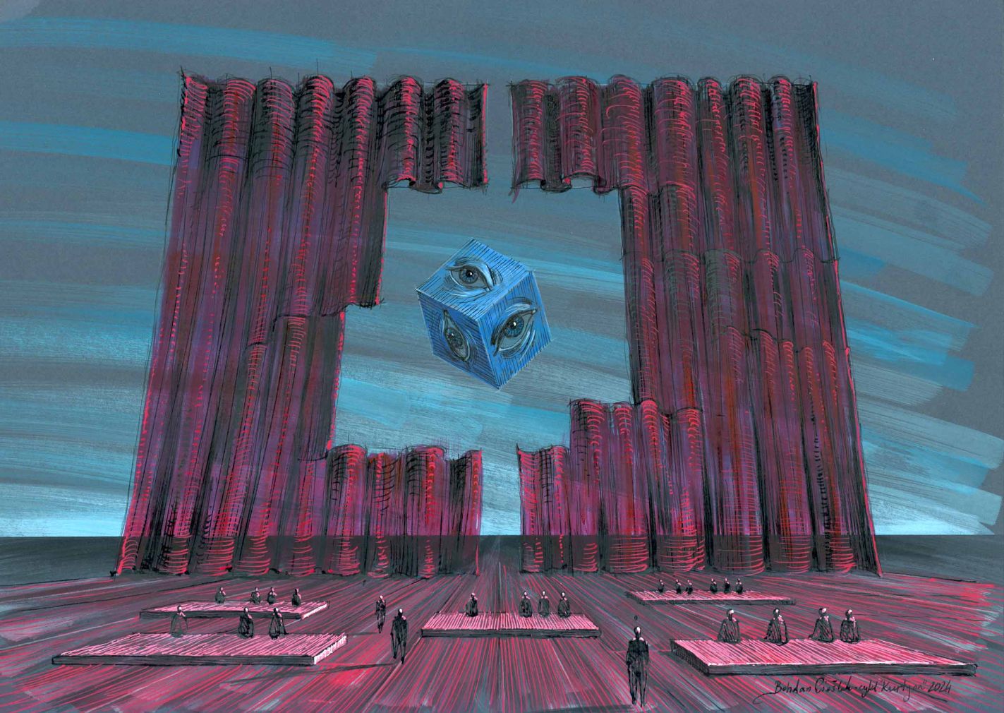 "Na wystawie «Kurtyna i dystopia» w Teatrze Ósmego Dnia zdecydowałem się zaprezentować we wspólnej przestrzeni dwa cykle rysunkowe: powstały w zeszłym roku cykl «Argoland I» uzupełniony o prace wcześniej nieupublicznione oraz cykl "Kurtyna" przygotowany specjalnie z myślą o tejże wystawie.