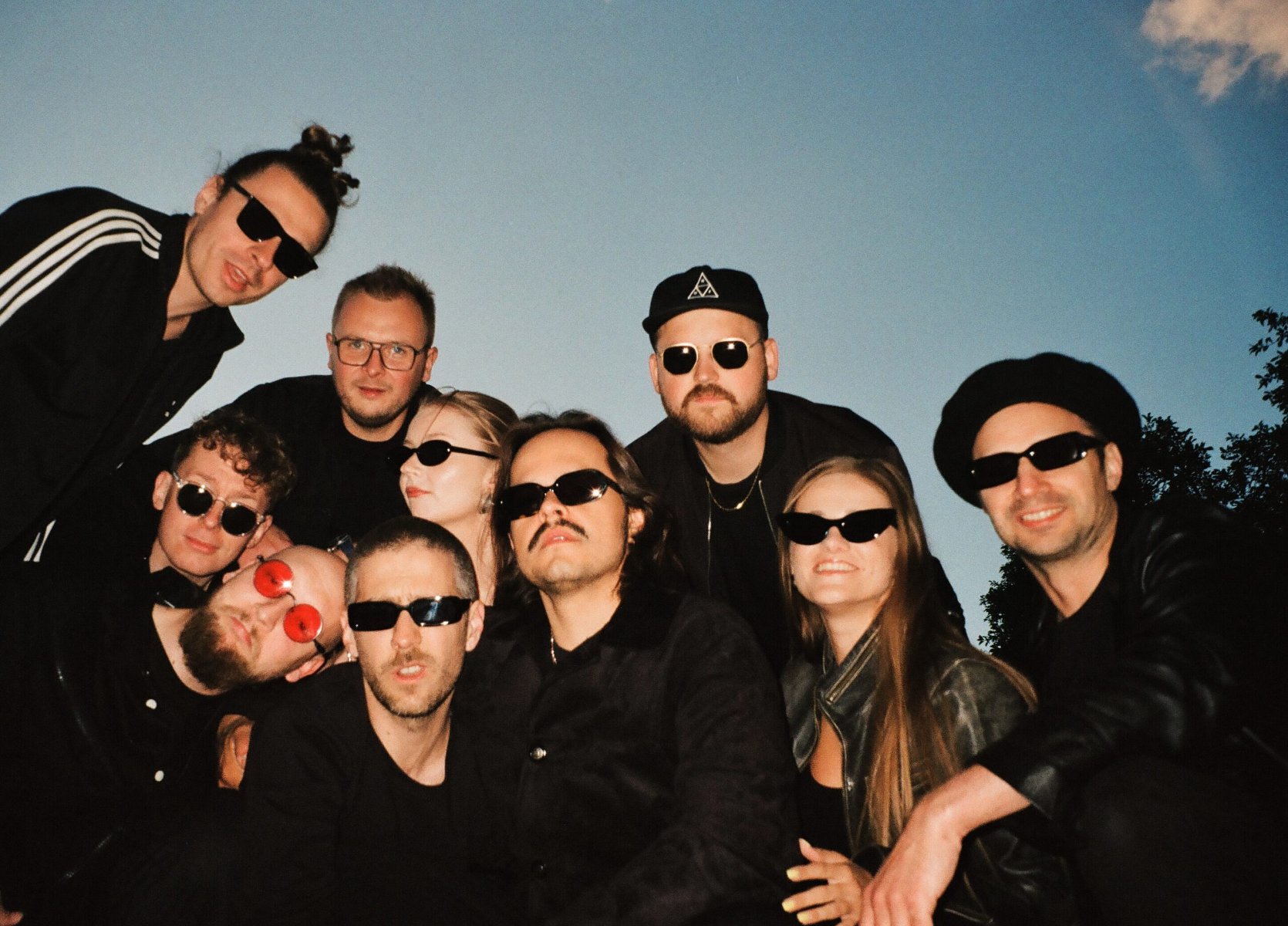 Zdjęcie grupy artystów stojących na tle nieba. Część osób kuca, część jest pochylona. Większość ma ciemne okulary. Wszyscy ubrani są w czarne ubrania.