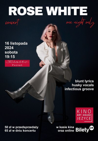 Rose White - urodzona w Szczecinie, studiowała prawo w Poznaniu, dziś mieszka i pracuje w Londynie, niejednokrotnie porównywana do takich ikon jak Amy Winehouse, Duffy czy Peggy Lee, fuzja ponętnego i soulowego wokalu z łatwo wpadającymi w ucho melodiami, stawiająca coraz większe i pewniejsze kroki w branży muzycznej - zagra w Kinie Rialto w Poznaniu.