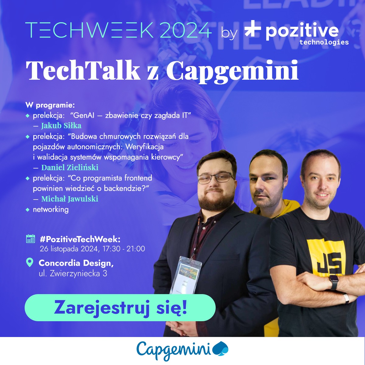 Zapisz się na TECH TALK Capgemini - wyjątkowe wydarzenie w ramach Pozitive TechWeek! Już 26 listopada zapraszamy do Concordia Design, gdzie czekają na Was 3 godziny merytorycznej wiedzy od ekspertów Capgemini Polska! https://www.capgemini.com/pl-pl/aktualnosci/wydarzenia/tech-talk-poznan-pozitivetechweek