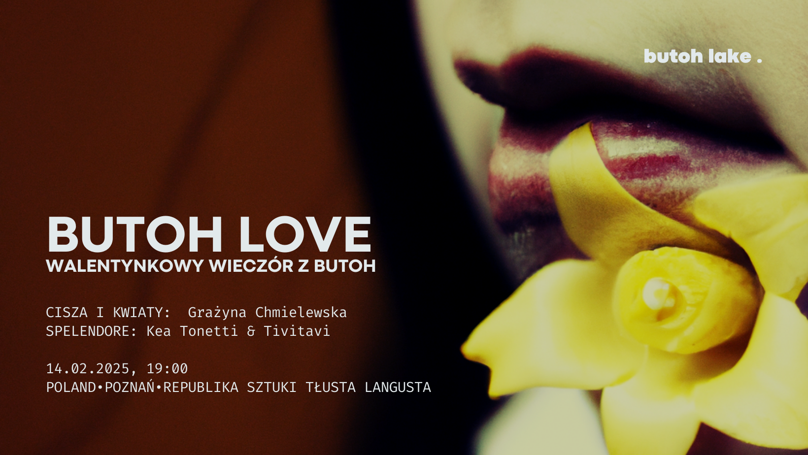 Plakat wydarzenia: usta z przyłożonym do nich żółtym kwiatem, z lewej strony informacje o wydarzeniu. Pobierz baner (PNG, 1,45 MB)
