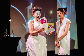 Dwie aktorki w białych sukienkach na Scenie Roboczej w spektaklu Jest tylko jedna. Pobierz baner (JPEG, 16,66 kB)
