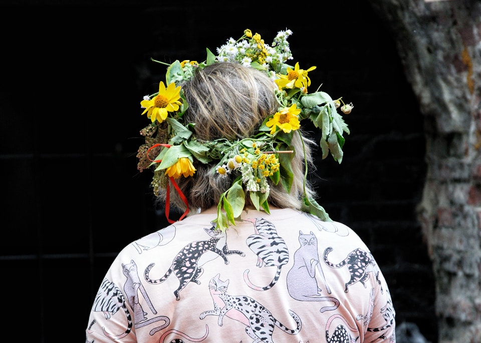 Osoba odwrócona tyłem. Na głowie ma wianek z żółtych i polnych kwiatów. Na sobie ma różową koszulę z printem w koty.