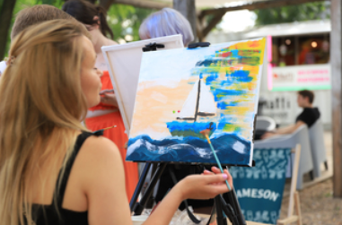Osoba maluje obraz na sztaludze farbami akrylowymi. Pobierz baner (PNG, 196,26 kB)