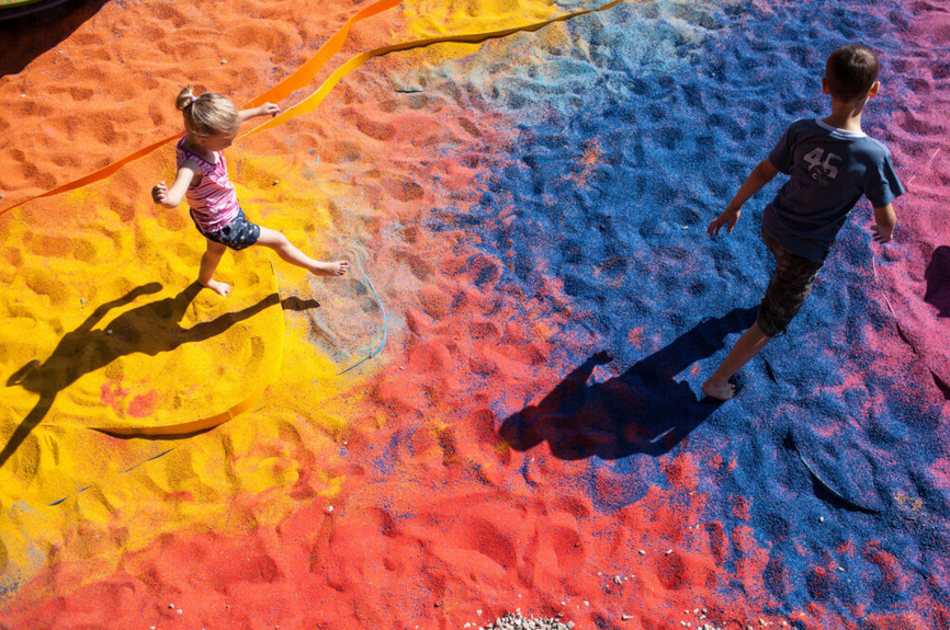 Dzieci chodzące po kolorowym, barwionym kruszywie.