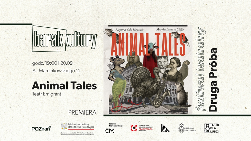 W ramach festiwalu "Druga próba. Teatr ponad granicami" Teatr Emigrant zaprezentuje premierę spektaklu "Animal Tales". Będzie to egzystencjalny kabaret inspirowany sztuką Dona Negro, opowiadający o rozterkach zwierząt cyrkowych, które mogą wydawać się bliskie ludzkim dylematom moralnym. Spektakl grany będzie w języku polskim z fragmentami w językach: białoruskim, ukraińskim, rosyjskim i angielskim. W obsadzie wystąpią artystki Teatru Emigrant, który od lat rezyduje w Baraku Kultury.