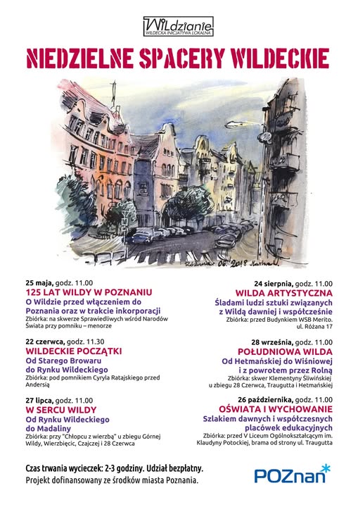 Niedzielne Spacery Wildeckie to seria darmowych wycieczek przygotowanych przez Wildecką Inicjatywę Lokalną WILdzianie. To już kolejna edycja tej popularnej formy poznawania Wildy. Od maja do października, raz w miesiącu, przewodnicy oprowadzą uczestników po jednej z najbardziej urokliwych dzielnic Poznania, odkrywając jej historię i niepowtarzalny klimat.