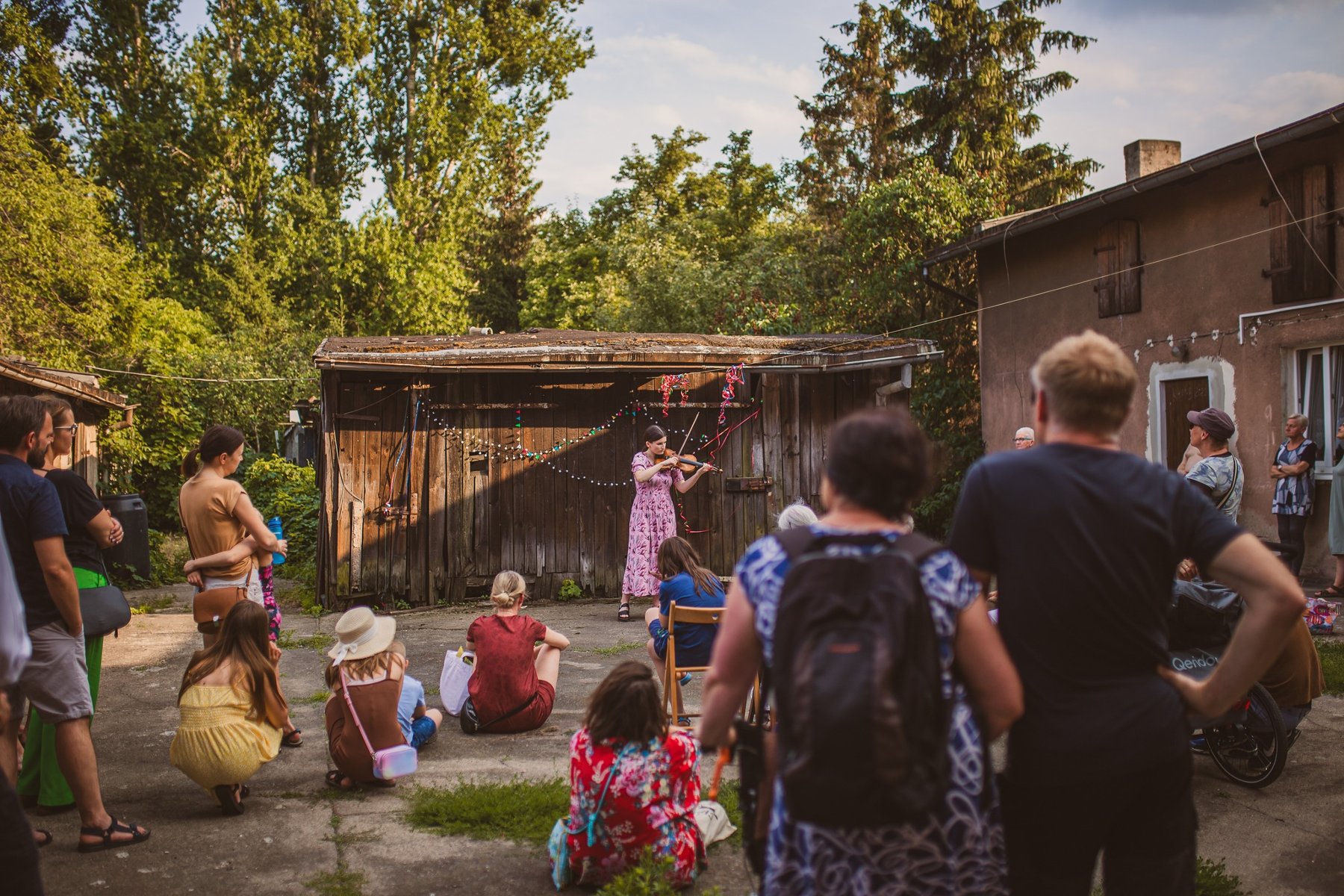 Tłum słucha kobiety grającej na skrzypcach na kameralnym podwórku domu.