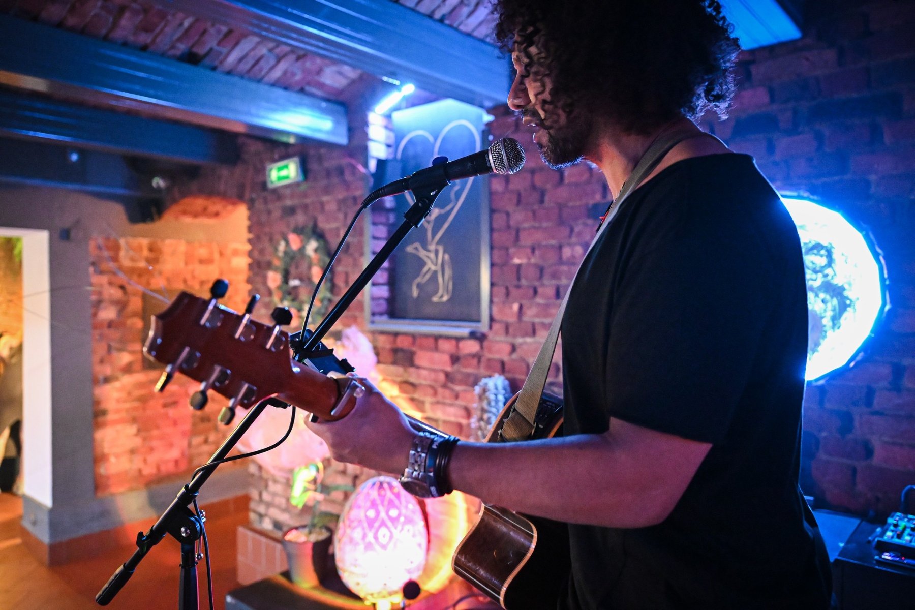 Mężczyzna z kręconymi włosami. Trzyma w rękach gitarę. Śpiewa do mikrofonu. W tle ceglana ściana z ozdobami.