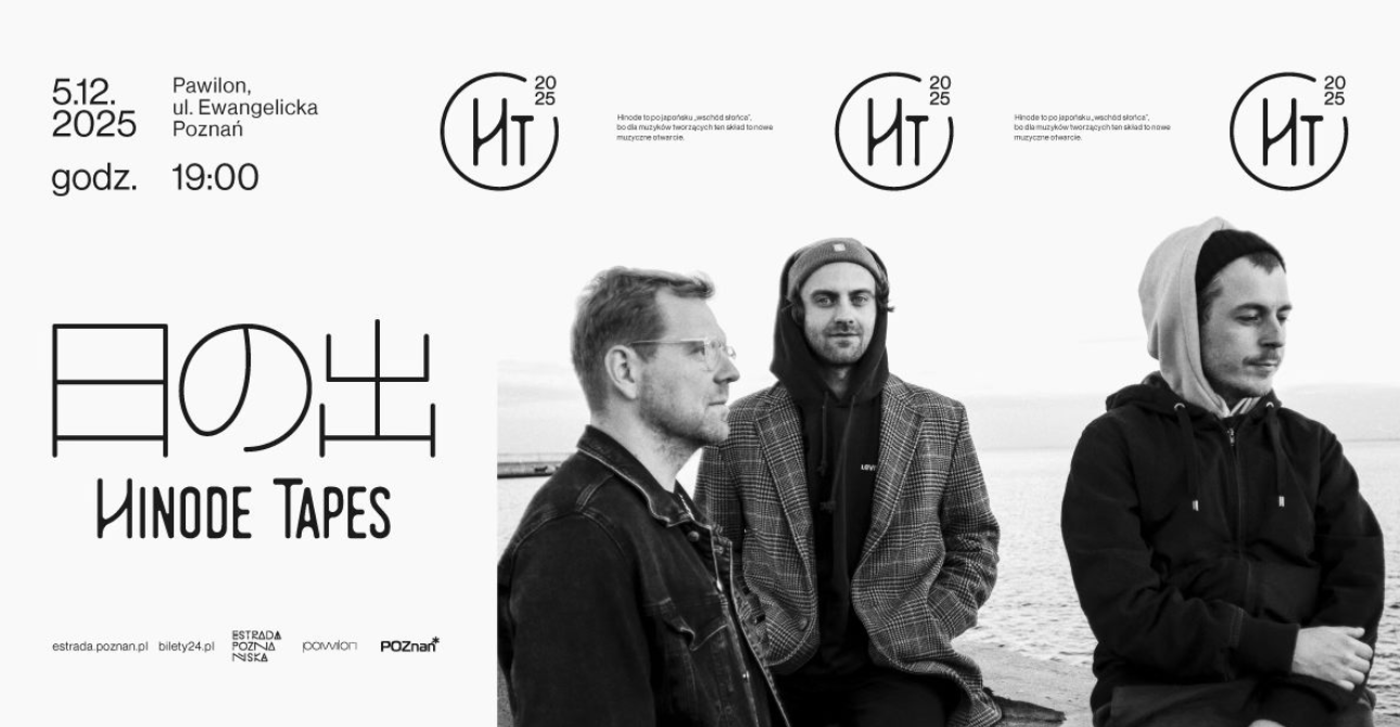 Plakat koncertu Hinode Tapes w Poznaniu. Widoczny napis: "5.12.2025, godz. 19:00, Pawilon, ul. Ewangelicka, Poznań". Tło czarno-białe, z trzema osobami siedzącymi nad wodą oraz japońskimi znakami i nazwą zespołu. Pobierz baner (PNG, 493,41 kB)