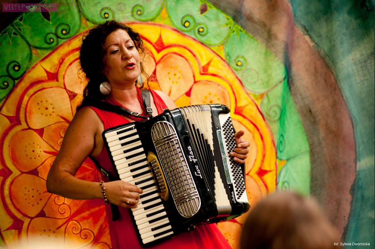 Kobieta o ciemnych kręconych włosach, ubrana w czerwoną sukienkę, gra na akordeonie i śpiewa. W tle widoczny jest kolorowy, dekoracyjny wzór w ciepłych odcieniach zieleni, żółci i pomarańczy.