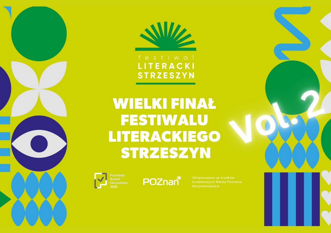 lakat Wielkiego Finału Festiwalu Literackiego Strzeszyn Vol. 2 na jasnozielonym tle z kolorowymi geometrycznymi elementami i logotypami organizatorów.