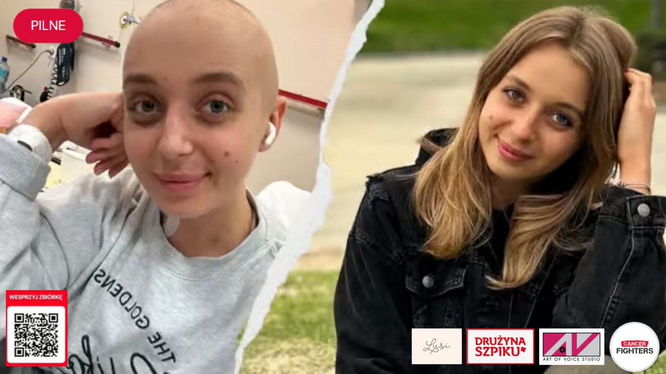 Plakat, który promuje koncert charytatywny, podczas którego będą zbierane pieniądze na leczenie młodej dziewczyny. Na plakacie dwa zdjęcia dziewczyny: przed i w trakcie leczenia. Pobierz baner (PNG, 1,19 MB)