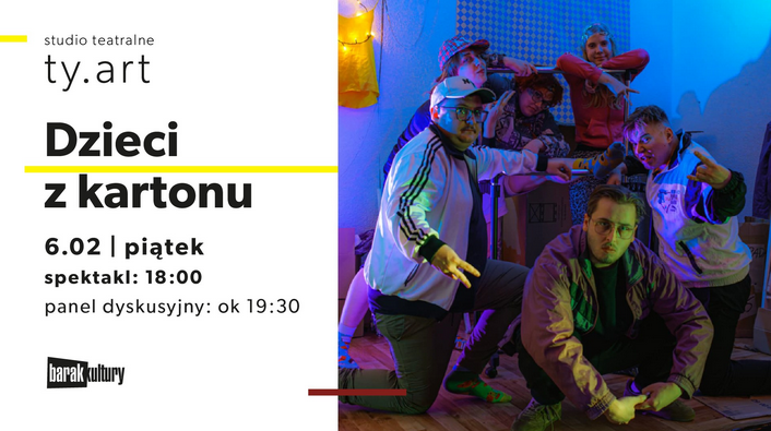 Dzieci z kartonu to podróż w świat pokolenia dorastającego w cieniu lat 90., między kasetą a Spotify, między Tamagotchi a smartfonem. Milenialsi, dorosłe dzieci transformacji, wciąż pakują i rozpakowują swoje życia, szukając miejsca, w którym można zatrzymać się na dłużej. Po spektaklu odbędzie się panel dyskusyjny poświęcony zarówno występowi, jak i trwającej w Baraku Kultury wystawie "Childhood. Postsoviet song".