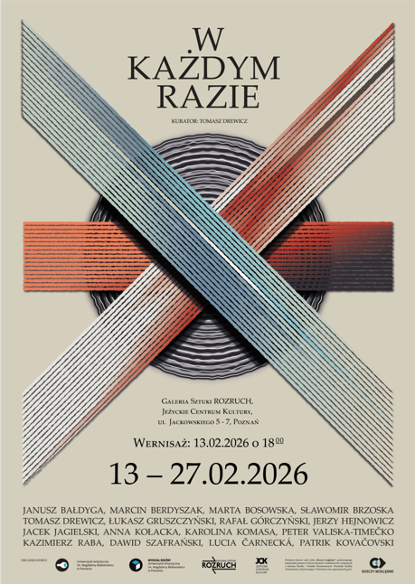 Abstrakcyjna kompozycja na beżowym tle, w której centrum znajduje się ciemnoszary, kolisty element o pofałdowanej strukturze. Na okrąg nałożone są trzy szerokie pasy przecinające się w środku, złożone z gęstych, równoległych linii. Pasy charakteryzują się gradientami w kolorze niebieskim, czerwonym i białym. Powyżej tytuł wydarzenia. Poniżej najwazniejsze informacje zawarte w treści artykułu.